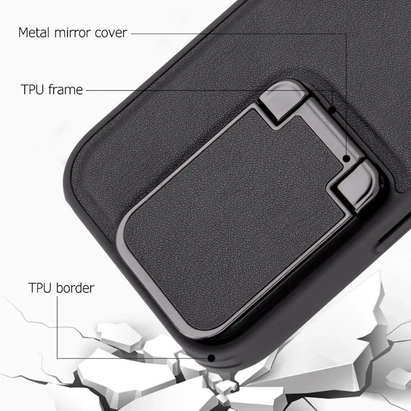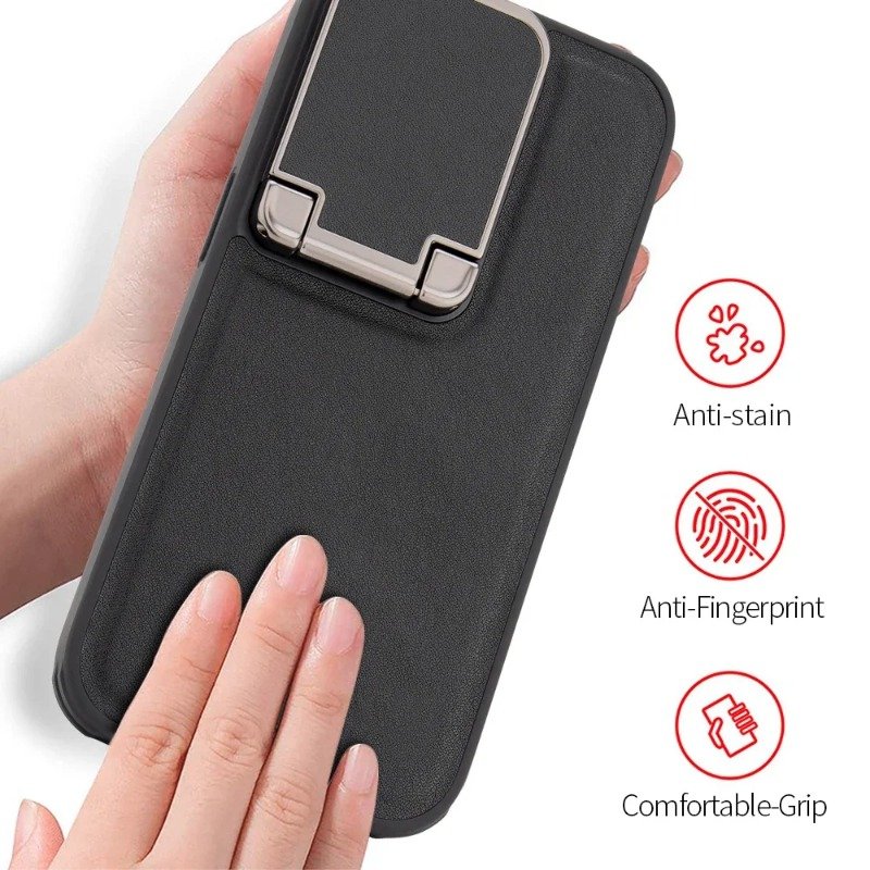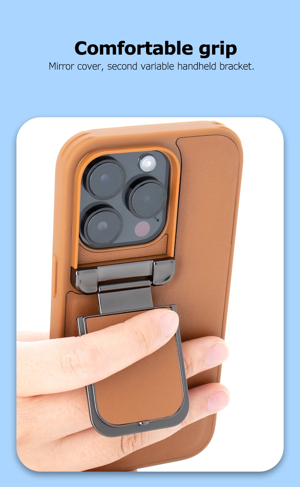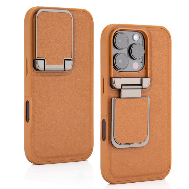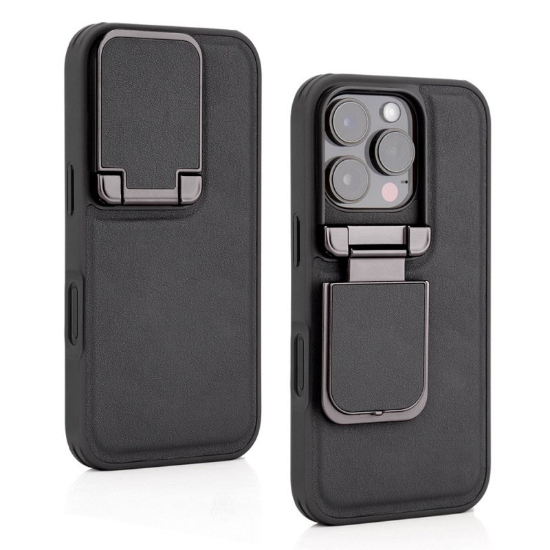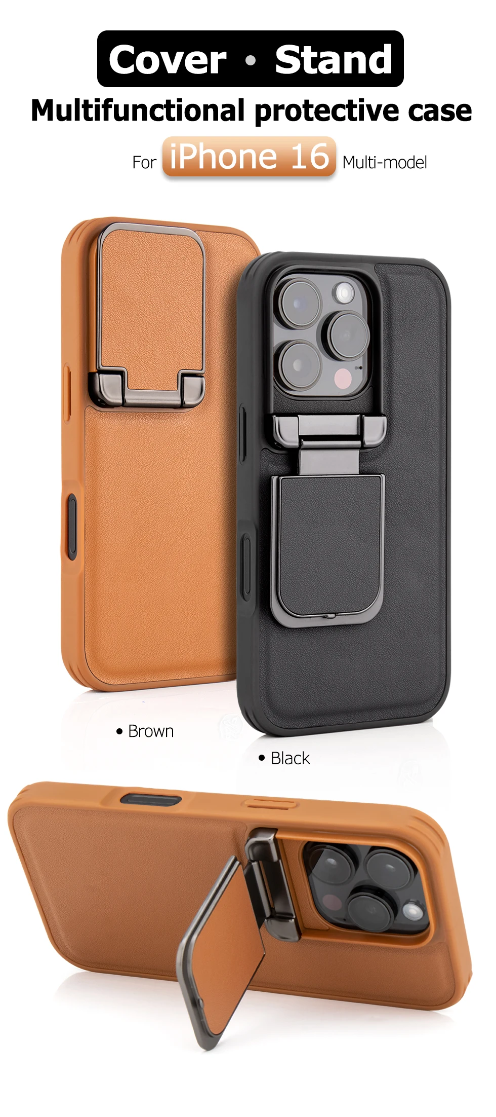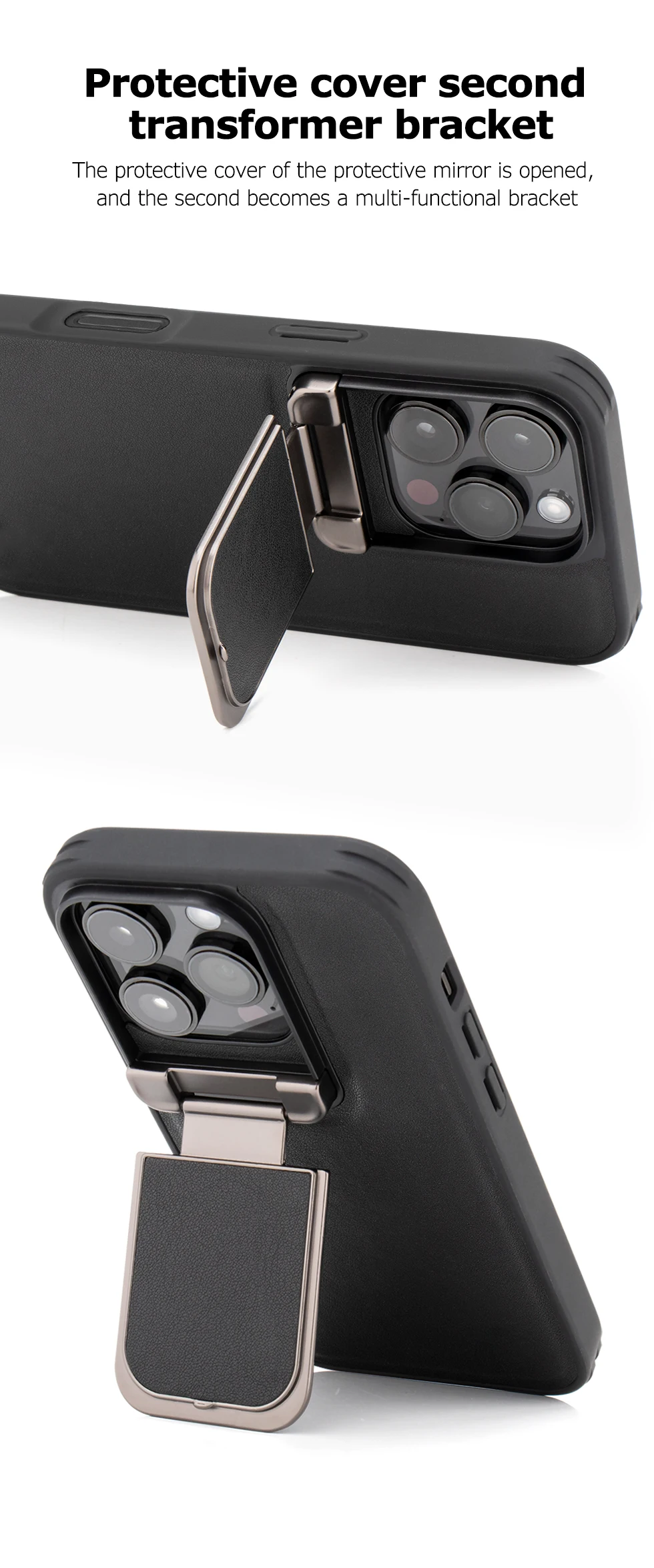 iPhone 16/15 Pro Max Series Genuine Leather Back Lens Protection Cover, Anti -Scratch and Protect Privacy Flip Aluminum Alloy Stand Slim Cover